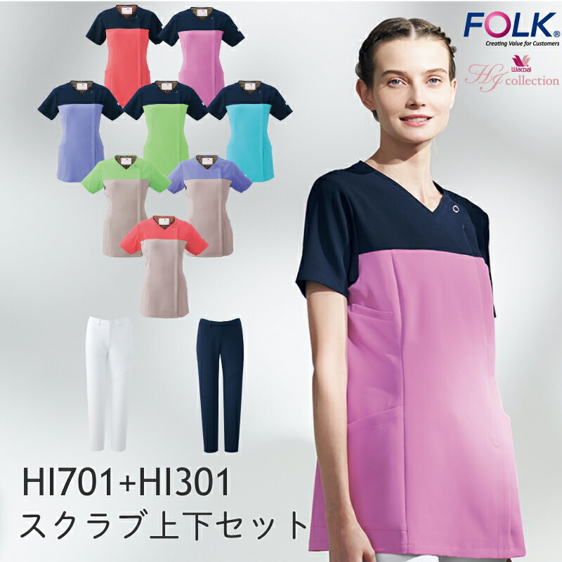 【楽天スーパーセール開催中!】スクラブ 白衣 かわいい ワコール 上下セット パンツ おしゃれ レディース 裏地メッシュ ネオα 両脇ポケット 脇ゴム 前ファスナー ストレッチ HI301 HI700 スリム 白衣 医療 フォーク FOLK