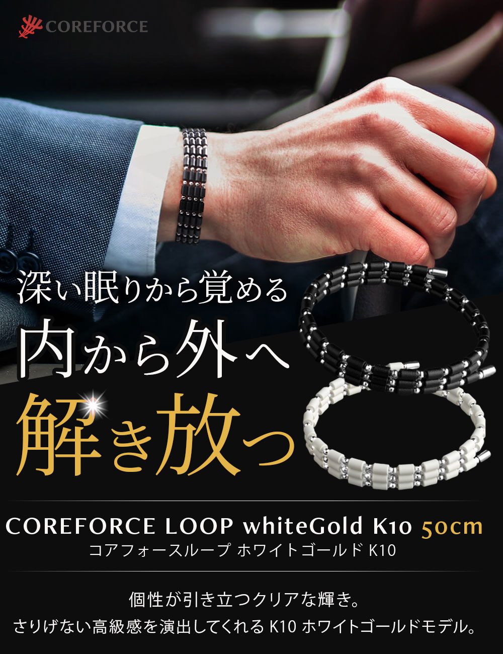 さりげない高級感を演出する「コアフォースループ K10 ホワイトゴールド 50cm」 コアフォースとは? 独自の技術で加工した天然の希少原料をコーティングすることで、身体本来が持つ潜在的なパワーを引き出します。