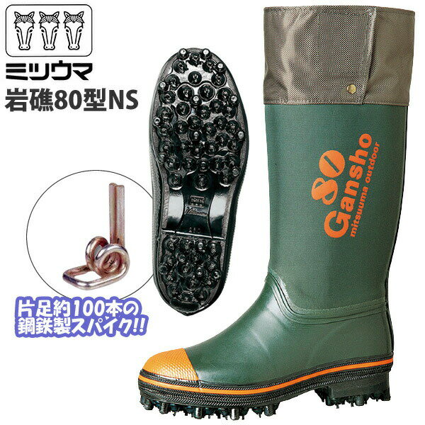 ミツウマ 日本製 スパイクピン付ノンスリップ長靴 男女兼用 岩礁80型NS No.204101 ●無数のピンが滑りやすい路面をしっかりキャッチ! ●ブルドーザーに削られたツルツル路面・険しい山道やむかるんだ悪路・登山や山菜取り・岩場での釣りなどに最高の威力を発揮します。