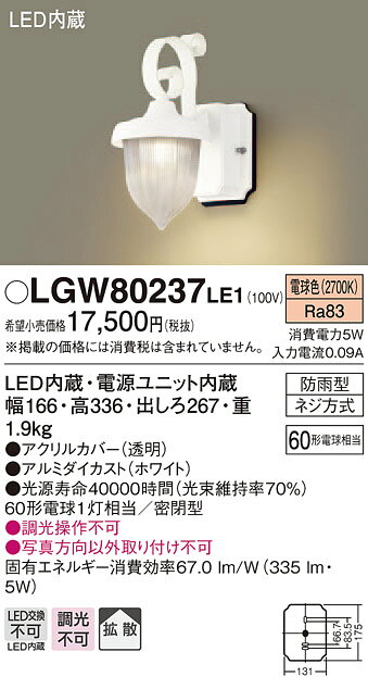 エクステリア 屋外 照明 ライト パナソニック(Panasonic) 照明器具 LGW80237LE1 ホワイト ブラケットライト かわいい ポーチライト 玄関灯 門柱灯 LED 電球色