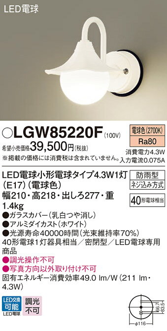商 品 詳 細商品名パナソニック エクステリアライトメーカー名パナソニック Panasonicメーカー器具名称エクステリアライト ブラケットライト ポーチライト光源◆LED電球小形電球タイプ4.3W1灯(E17)(電球色) ◆色温度:2700 K ◆光源寿命40000時間(光束維持率70%)寸法・質量◆幅:210 mm ◆高:218 mm ◆出しろ:277 mm◆質量:1.4 kg仕様◆器具光束:219 lm ◆電圧:100 V ◆消費電力:4.3 W ◆消費効率:50.9 lm/W◆デザイン分類:French Chic◆【ガラスカバー】乳白つや消し◆【アルミダイカスト】ホワイト◆Ra80◆40形電球1灯器具相当◆密閉型◆LED電球専用商品◆入力電流(100V時):0.08 A◆調光操作不可◆写真方向以外取り付け不可注意事項◆調光操作不可 ◆写真方向以外取り付け不可 ※施工・電気工事は専門業者にご依頼ください。