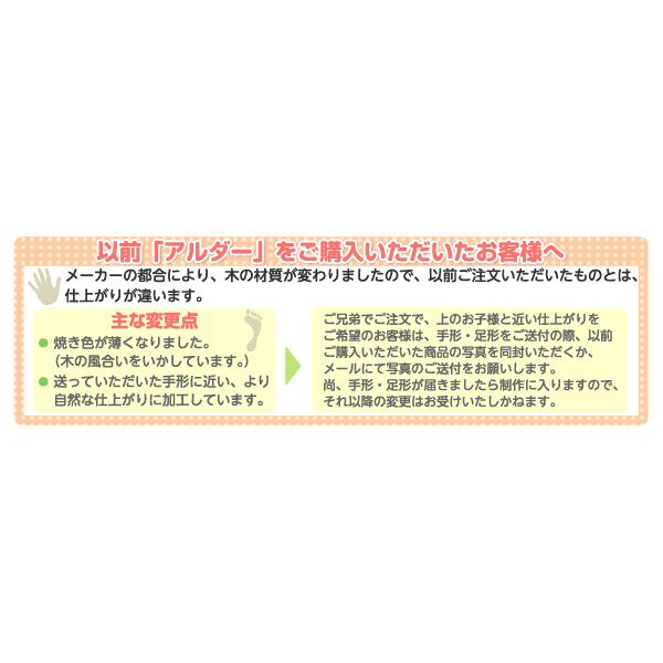 ギフト対応 サイズ w160×h210 材 質 木製 備 考 ご自宅用の場合、ご注文頂きましたら、お申込書とお子様の手型・足型を取って頂く為の採取キット(専用発色紙×1、発色液パック×1)を送らせて頂きます。