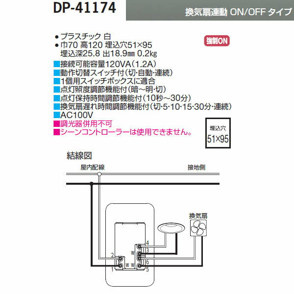 ●プラスチック 白 ●サイズ:巾70 高120 埋込穴51×95 埋込深25.8 出18.9mm ●重量:0.2kg ●接続可能容量120VA(1.2A) ●動作切替スイッチ付(切・自動・連続) ●1個用スイッチボックスに適合 ●点灯照度調節機能付(暗〜明・切) ●点灯保持時間調節機能付(10秒〜30分) ●換気扇遅れ時間調節機能付(切・5・10・15・30分・連続) ●AC100V ●調光器併用不可 ●シーンコントローラーは使用できません。